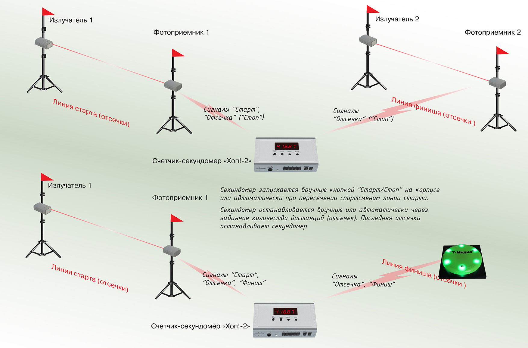 Также предусмотрен комбинированный режим, при котором старт (начало отсчета) выполняется тренером, а финиш (или преодоление дистанции) – автоматически при пересечении светового луча.